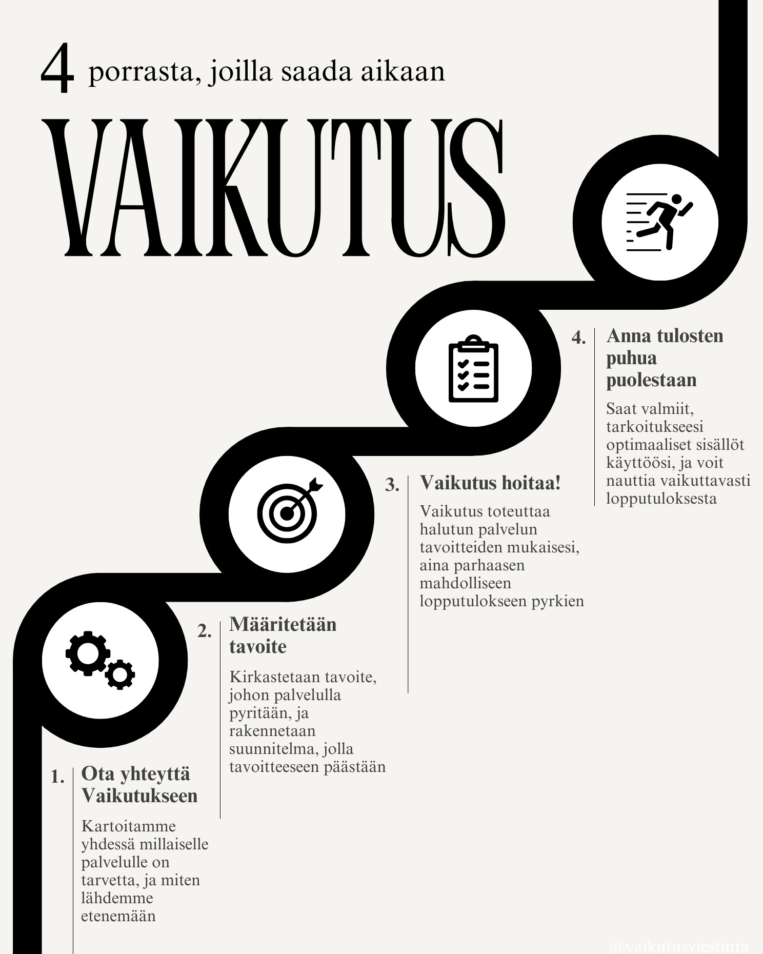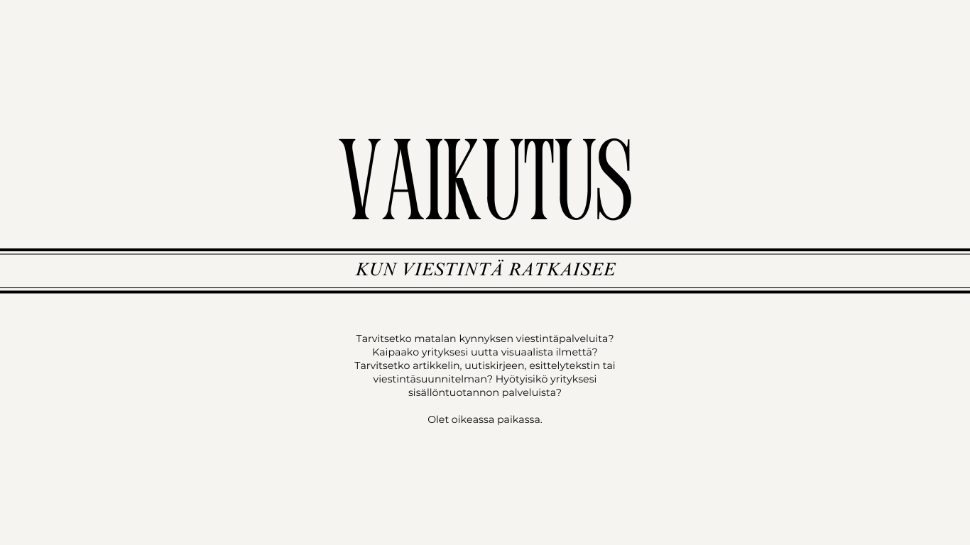 Vaikutus tarjoaa viestinnän, sisällöntuotannon, brändäyksen ja kielenhuollon palveluja kaikille niitä kaipaaville yrityksille, organisaatioille, järjestöille ja yksityishenkilöille.